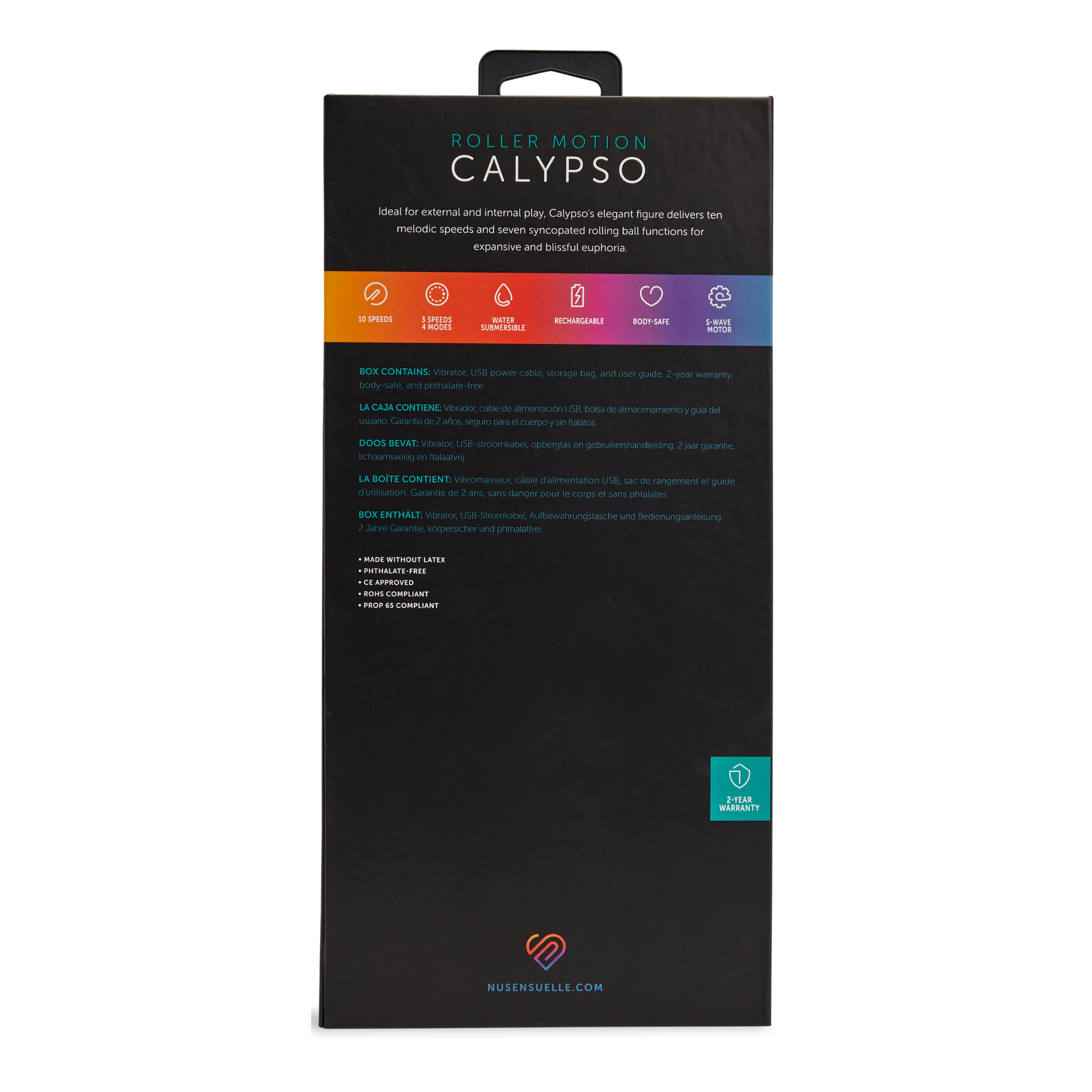 Move to the innovative rhythms of the roller motion Calypso from Nu Sensuelle. With a billowing ball for targeted stimulation and expansive vibrations for all-over pleasure, Calypso is ideal for internal and external play. Calypso’s elegant figure, sweetened with flexibility, delivers ten melodic speeds as personal massager that set the mood. Engage the seven syncopated rolling ball functions, kick up your heels, and rejoice in the warmth of blissful euphoria. Thoughtfully designed, the vibration and rolling ball can be used simultaneously or independently of each other, giving you the liberty to choose your happiness.